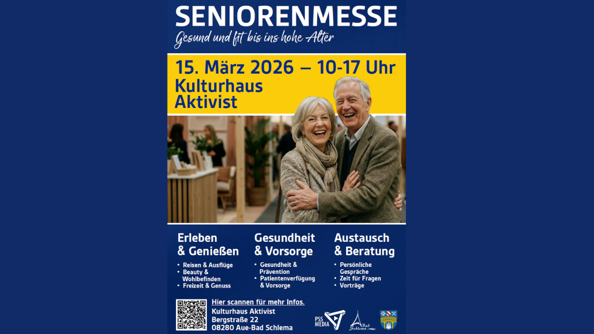 Am 15. März 2026 findet von 10 bis 17 Uhr die Seniorenmesse im Kulturhaus Aktivist in Aue-Bad Schlema statt – und wir sind mit dabei!