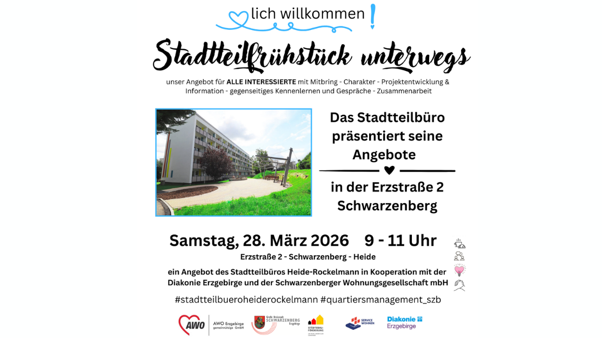 Einladung des Stadtteilbüros Heide-Rockelmann am Samstag, 28. März 2026 von 9 bis 11 Uhr in der Erzstraße 2 in Schwarzenberg, Austausch, Kennenlernen und Information über Angebote im Stadtteil.