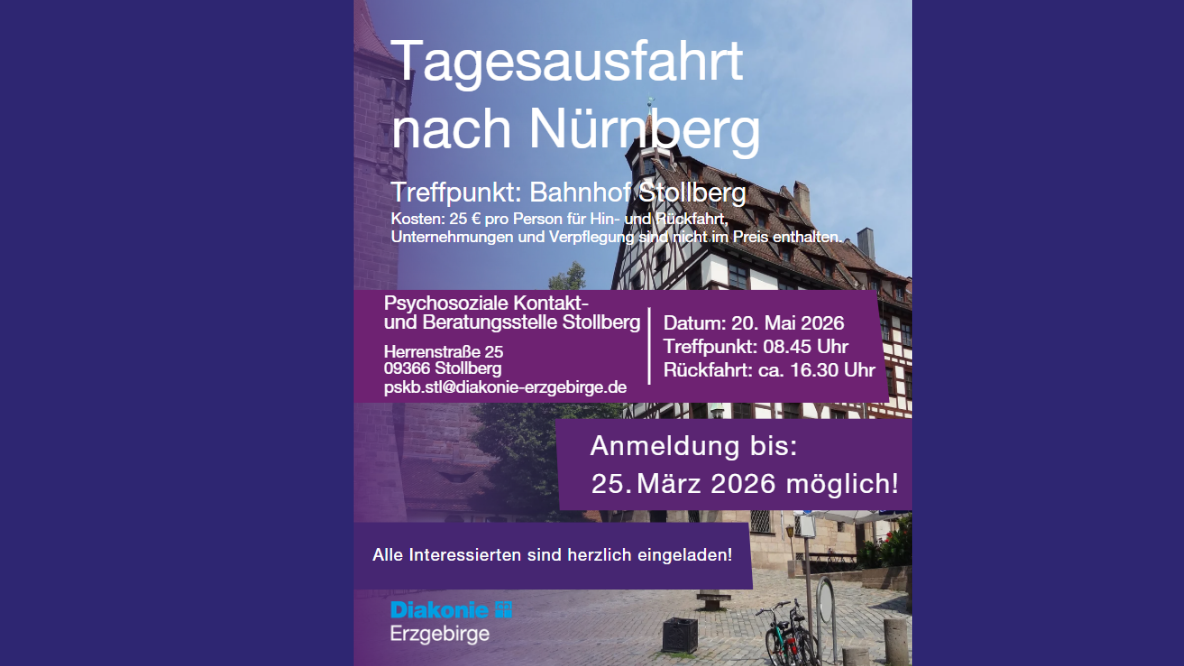 Am 20. Mai 2026 laden wir herzlich zu einer gemeinsamen Tagesausfahrt nach Nürnberg ein. Verbringen Sie mit uns einen abwechslungsreichen Tag in angenehmer Gesellschaft und entdecken Sie die vielfältigen Möglichkeiten der Stadt.