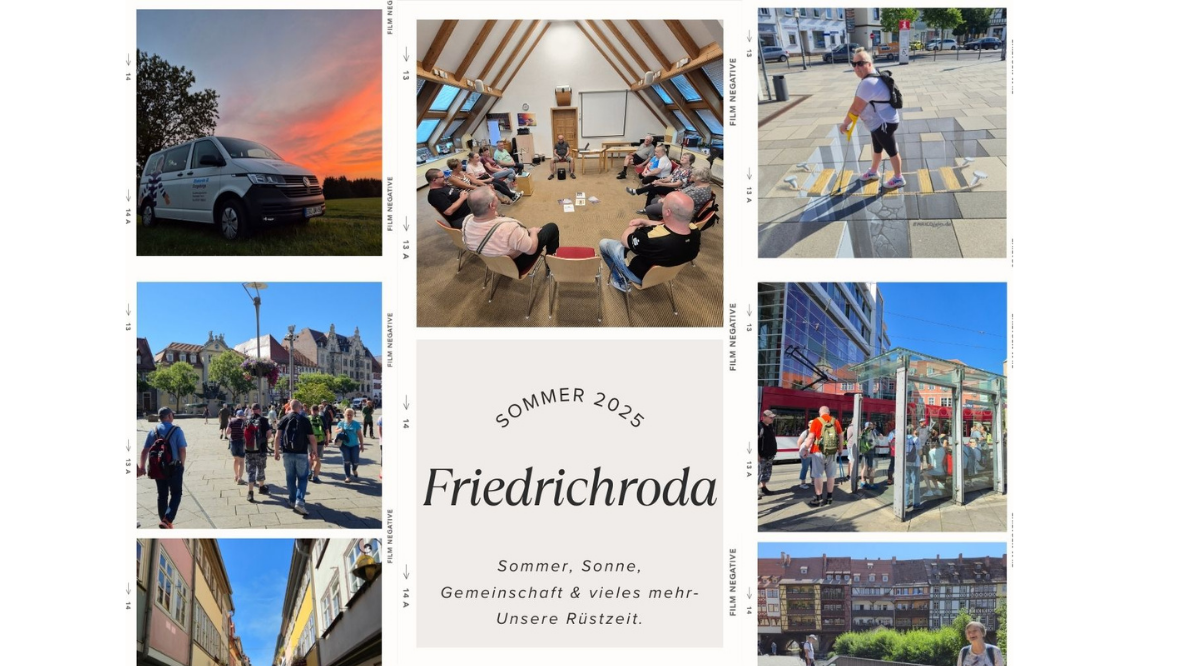 Unsere Urlaubswoche 2025 fand vom 18. bis 22. August statt und führte uns nach Friedrichroda (Thüringen) in das Haus der Stille. Diese besondere Zeit bezeichnen wir bewusst als „Rüstzeit“, da sie Raum bietet, innezuhalten, Gemeinschaft zu erleben und neue Impulse für den Alltag mitzunehmen.