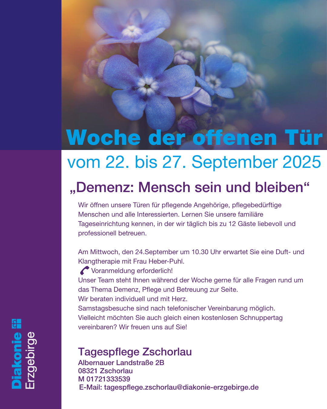 Herzlich Willkommen! in unserer Tagespflege Zschorlau. Information Information zu Woche der Demenz im Erzgebirgskreis PDF (226 kB) Diese Seite empfehlen